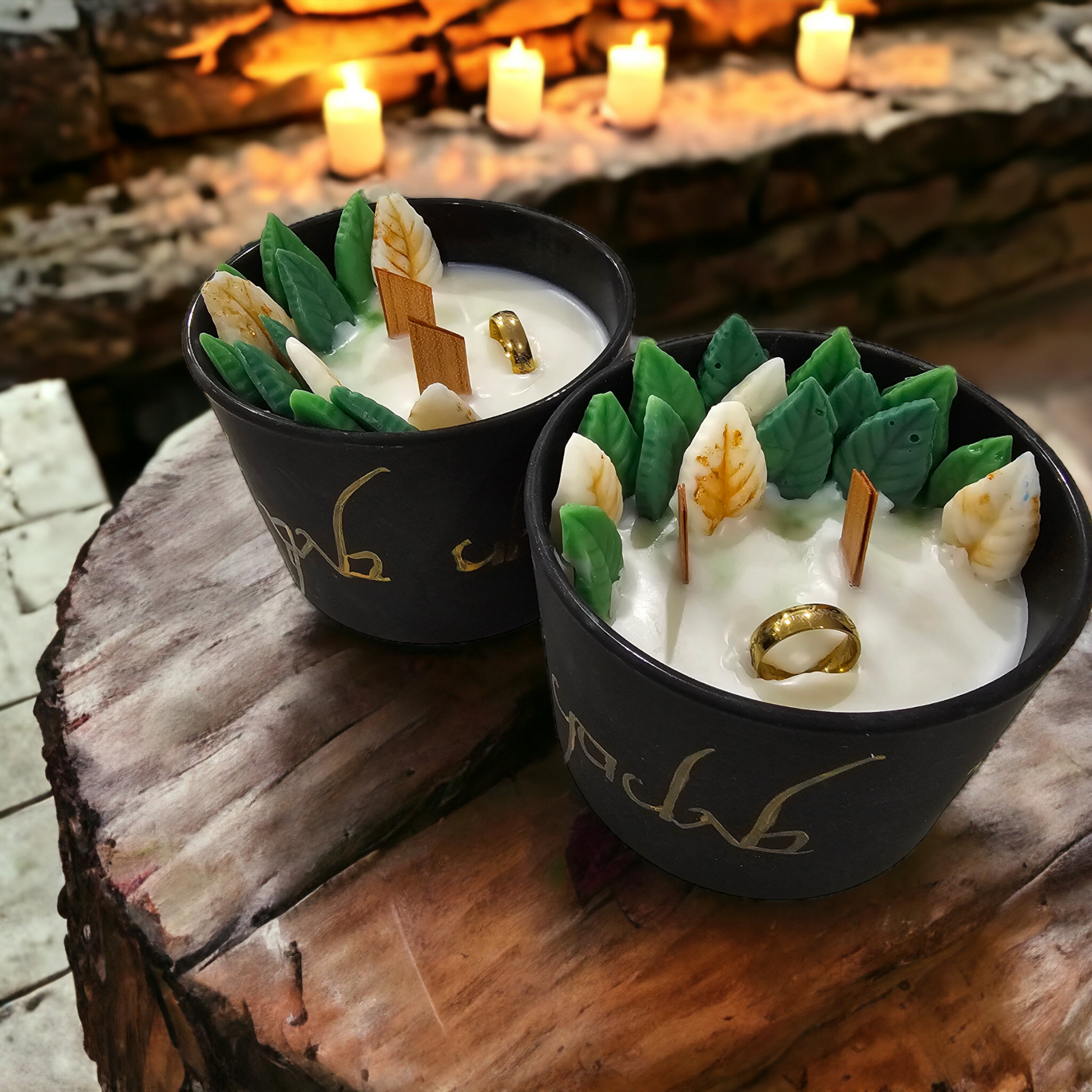 The lord of the rings inspired candle features a golden Tengwar script that says "one candle to rule them all" hand painted on the large matte jar. The candle is scented in Green Tea and Lemongrass for a real Hobbiton feal. Soy wax leaves line the side of the candle for a very Rivendell feeling. Topped off with two wooden wicks that crackle when burning and a real "One Ring" replica that can easily be removed from the candle.